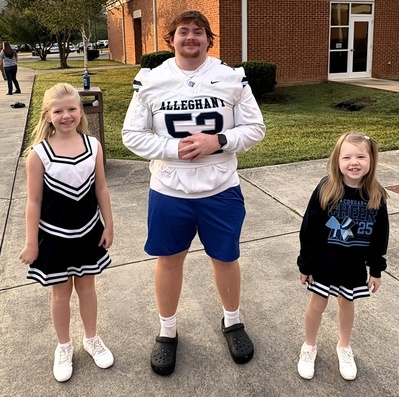 | AHS 11th grader and varsity football player Ben Phillips greets Mountain View Elementary car riders Norah Berberette (4th grade) and Hazel Berberette (2nd grade) during Friday’s Jersey Day celebration. Students were showing their spirit in full force for Jersey Day, celebrating the upcoming AHS game at Waynesboro that evening. Visits like these help build relationships and teach courtesy and respect to younger students. (AHPS Photo)