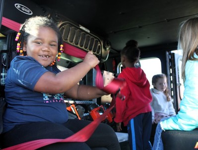 | Mountain View Elementary kindergarten student Lillian Hickerson straps in as she climbs aboard a fire truck during a Fire Prevention Week visit from the Selma and Clifton Forge Fire Departments. Local firefighters were on hand to teach fire safety and prevention. This is a great example of the important work local firefighters do for the community. (AHPS Photo)