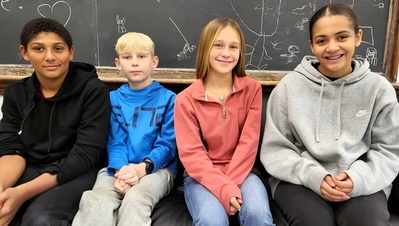 | Covington, VA (Nov. 10, 2025) - From left, Austin Hoke, Jaxon Via, Miyah Howard, and Tamia Allen are thriving in seventh-grade Strategies classes at Covington Middle School. Students are developing skills in math and English, including solving two-step equations and enhancing their reading and writing abilities, with strong support from teachers and the community. (AHPS Photo)