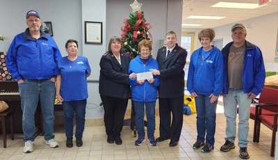 | Alleghany Cruisers Treasurer Mickey Floyd presents a check to Salvation Army Majors Dee and Gary Stewart for funds raised during the 4th Annual Holiday Hot Rod Round Up. This ebmvent is held annually in Covington VA by the Alleghany Cruisers and is a fund raiser for the Salvation Army's Angel Tree program which benefits area children in need during the Christmas season. From left Alleghany Cruisers President Robert Floyd, member Tina Carter, Major Dee Stewart, Alleghany Cruisers Treasurer Mickey Floyd, Major Gary Stewart, Alleghany Cruisers Secretary Heather Simmons, and Alleghany Cruisers Vice President John Sprouse.