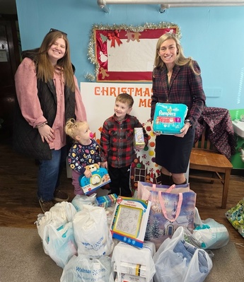 | Cornerstone Church in Covington has donated several items (including sheets, towels, toys, and diapers) to the Alleghany Highlands Christmas Mother Program. Pictured from left are Shelby Slone and her children, Mia & Gunnar, of Cornerstone, and Rachael Thompson, Christmas Mother.