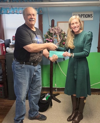 | The Covington Ruritan Club has made a donation to the Christmas Mother Program. Pictured here is Kevin Hanna of the Ruritans (left) and Rachael Thompson, Christmas Mother.