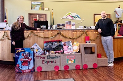| The Alleghany Highlands Chamber of Commerce & Tourism has been hard at work conducting a toy drive for the Alleghany Highlands Christmas Mother Program. This is the second large collection to date. Pictured here are the Christmas Mother (left), Josh Taylor, Executive Director of the Chamber, and Pam Warren, also of the Chamber.
