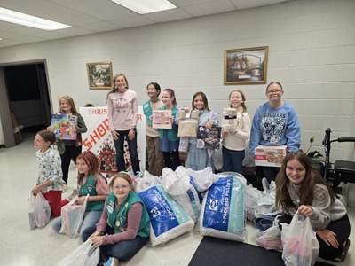 | Girl Scout Troop 1281 recently presented items to the Christmas Mother Shop. The donated items were purchased with funds that they earned through selling their handmade crafts. Pictured here is the troop with Rachael Thompson.