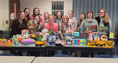 | The Mountain Gateway Community College Nursing Student Association recently made a donation of toys and household items to the Alleghany Highlands Christmas Mother Program. They are pictured here with Rachael Thompson (center).
