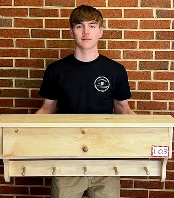 | Maddox Wickline, Class of 2026, displays a recent carpentry project at Jackson River Technical Center. He is enrolled in both electricity and carpentry courses, exploring a career in electrical work while gaining hands-on building experience. Fifteen Alleghany High students are taking multiple career-technical programs at JRTC, with several on track to earn double certificates. (JRTC Photo)