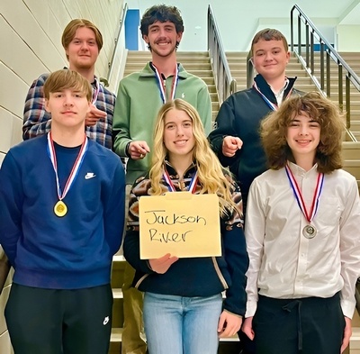 | Jackson River Technical Center students fared well in the recent SkillsUSA District VII competition. An awards ceremony was held Feb. 11 at Blacksburg High School. Front row, from left, are Maddox Wickline, first place in cabinet making; Katie Stull, third place in electrical construction; and Elijah Halterman, second place in drafting. Back row, from left, are Zeke Saville, first place in electrical construction; Landon Arritt, third place in automotive technology; and Braylon Johnston, second place in welding. Wickline, Saville, and Halterman will compete at the SkillsUSA state competition in Virginia Beach in March. (JRTC Photo)