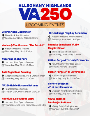 | Alleghany Highlands, VA – The Alleghany Highlands VA250 Planning Committee is proud to announce a series of events, exhibits, and community-wide initiatives taking place this spring and summer as part of America’s 250th anniversary. These efforts are aligned with VA250, Virginia’s official celebration of the nation’s 250th anniversary.