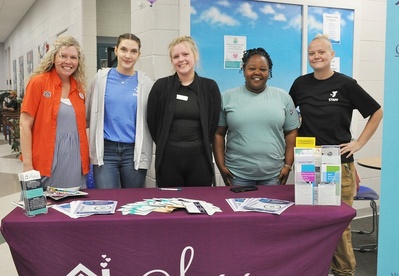 | (L to R) Lori Miller, Finance and Development at the YMCA; Hannah Hensley, YMCA Staff; Olivia Kessler, YMCA Staff; Brittany Stevens, Executive Director for Safehomes; and Christa Sheppard, YMCA Staff.