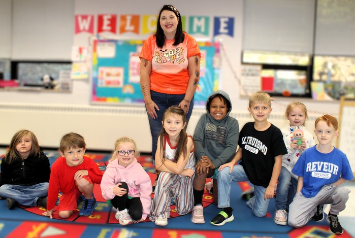 | Sharon Elementary first graders pose with teacher Katie Long on Oct. 24 during “Tattoo the Teacher Day.” Students contributed money to buy temporary tattoos for teachers and staff as a fun way to build school spirit. The event raised several hundred dollars to support school activities. Students, from left, are Raylund Tucker, Colt Goodson, Quinlynn McGuffey, Arya Berry, Delali Clayton, Jackson Dempsey, Rosaleigh Hostetter, and Matthew Goist. (AHPS Photo)