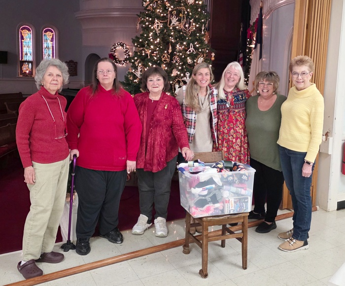 | Clifton Forge Baptist Church made a donation of socks and other clothing to the Alleghany Highlands Christmas Mother Program. Pictured here are members of the CFBC Women in Ministry, from left, Barbara Crissman, Mary Bess Baker, Lydia Nicely, Rachael Thompson (Christmas Mother), Tondalaya VanLear, Susan Meyer, and Gerry Hernandez.