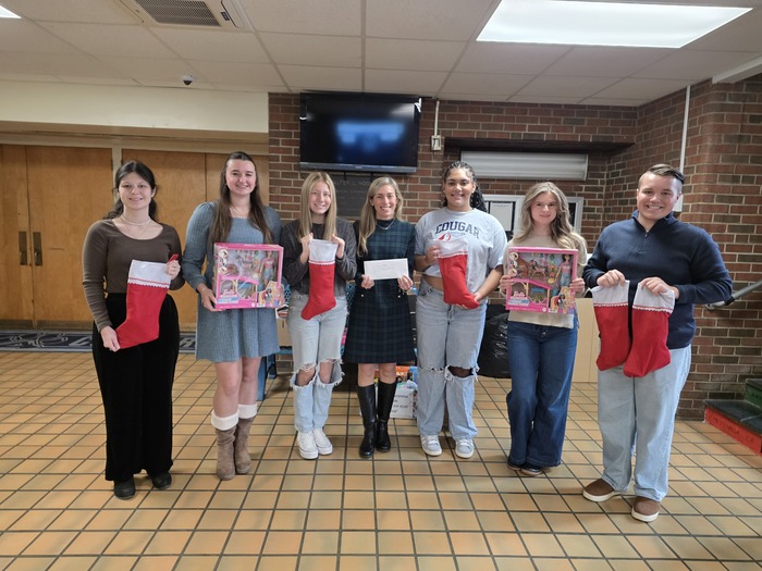 | Several student groups from Alleghany High School have made a sizeable donation to the Christmas Mother Program, including Key Club, Beta Club, Create for Kids Club, JV & Varsity Cheerleaders, and teacher Julie Meadows. Pictured here are representatives from several clubs, from left to right: Reagan Paitsel (Beta Club), Marissa Nicely (Varsity Cheer Captain), Lexy Wills (Varisty Cheer Captain & Key Club), Rachael Thompson (Christmas Mother), Janelle Hill (Varsity Cheer Captain), Willow Davis (Key Club), and Logan Walton (Key & Beta Clubs).