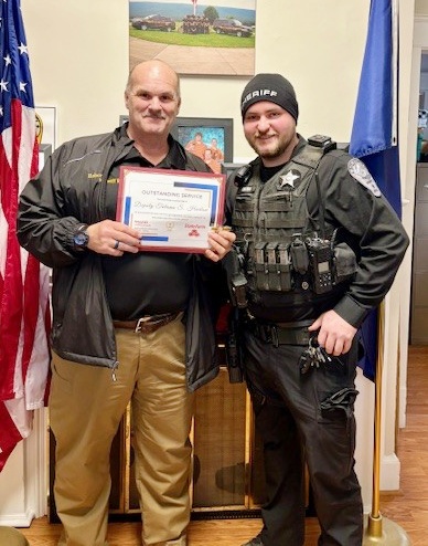 | Bath County Sheriff Robert Plecker presents the 2025 MADD (Mothers Against Drunk Driving) award to Deputy Tatumn Harlow. Deputy Harlow is a valuable asset to the Bath County Sheriff’s Office. Deputy Harlow is very deserving of this award, as this will be the 4th consecutive year that he has received it - 2022, 2023, 2024, and 2025.