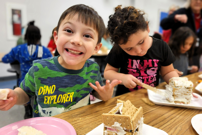 | Mountain View Elementary kindergarteners Holden Gwinn, left, and Maybelle Fisher take part in a gingerbread-building learning activity in December. Kindergarten orientation for the 2026-27 school year will be held at all Alleghany Highlands Public Schools elementary schools Feb. 19. (AHPS Photo)