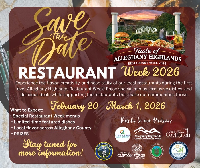Dates, the participating restaurants, and special offers will be announced soon. For updates and more information, follow Olde Town Covington, Inc., Clifton Forge Main Street and the Alleghany Highlands Chamber of Commerce and Tourism on social media or visit ahchamber.com/restaurant-week-2026/.