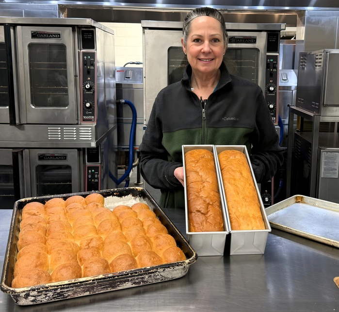 | Jennifer Hiner of the Jeter-Watson Elementary cafeteria crew tests new USDA bread and roll recipes. Alleghany Highlands Public Schools cafeteria workers always focus on quality and care to help ensure students enjoy fresh, nutritious meals every school day. (AHPS Photo)