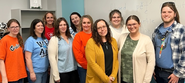 | Several Alleghany Highlands Public Schools elementary and middle school teachers completed Year One of LETRS (Language Essentials for Teachers of Reading and Spelling), a rigorous, graduate-level program focused on the science of reading. The teachers completed the training on their own time to better serve students. Pictured, from left: Alison McPherson, Christina Fields, Brandy Moye, Megan Stover, Katelyn Riley, Lynette Huffman, LeAnn Stout, Rachel Smith, Samantha Shelton, and Josh Saville. Not pictured: Abigail Newton, Kristi Weiss, and Elena Reed. (AHPS Photo)