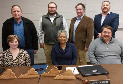 | Valley Ridge, VA (Feb. 21, 2022) - Members of the Alleghany County School Board were recognized Monday, February 22, 2022, as part of School Board Appreciation Month in February. Board members were presented with a certificate of appreciation and wooden plaques shaped like Virginia. The plaques were made by Career and Technical Education students at Clifton Middle School. First row from left: Vice Chair Danielle Morgan of the Clifton East District, Clifton Forge District West representative Patrice Jefferson, and Sharon District representative Jason Helmintoller. Second row: Covington District representative Gerald Franson; Falling Spring District representative John Littleton; Chair Jacob Wright of the Boiling Spring District; and Jackson River District representative Richard Shull. (ACPS Photo)