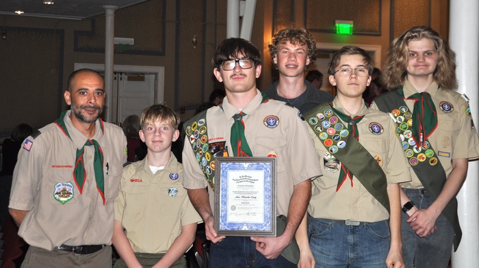 Laura Roberston Costigan, Key Club Advisor with the boys home, gave a slideshow presentation acknowledging the boys' dedication and hard work, then concluded with questions and answers. Girl Scout Troop 1281 began with the scouts honor and pledge, then each of the girl scouts, (Heidi Hale, Stella Miller, Shyanne Thornton, Miranda Thornton, Olivia Peter), gave a brief presentation. The Clifton Forge Scouting America Troop 2 was represented by Kenny Sprouse, Evan Hix, James Quantz (Eagle Scout), Ezra Smart, Landon Mullikin, Dominique Washington (Scoutmaster), and Skip McMallen (Assistant Scoutmaster). Scoutmaster Dominique Washington gave a brief presentation, then Bill Parks with Free Masons awarded James Quantz with a certificate of recognition.