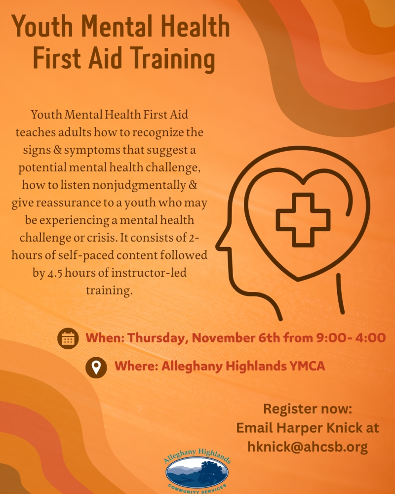 Click here to register for the Thursday, November 6th Youth Mental Health First Aid training session at the Alleghany Highlands YMCA. * * * * * Back to the Journal's Homepage.