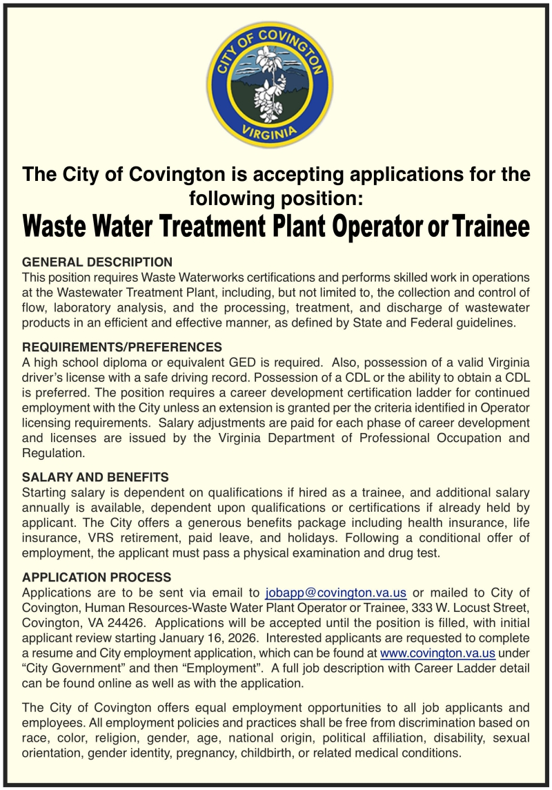 Click here to find a job application for this position * * * * * Click here to email your job application to the city of Covington * * * * * Back to the Journal's Homepage.